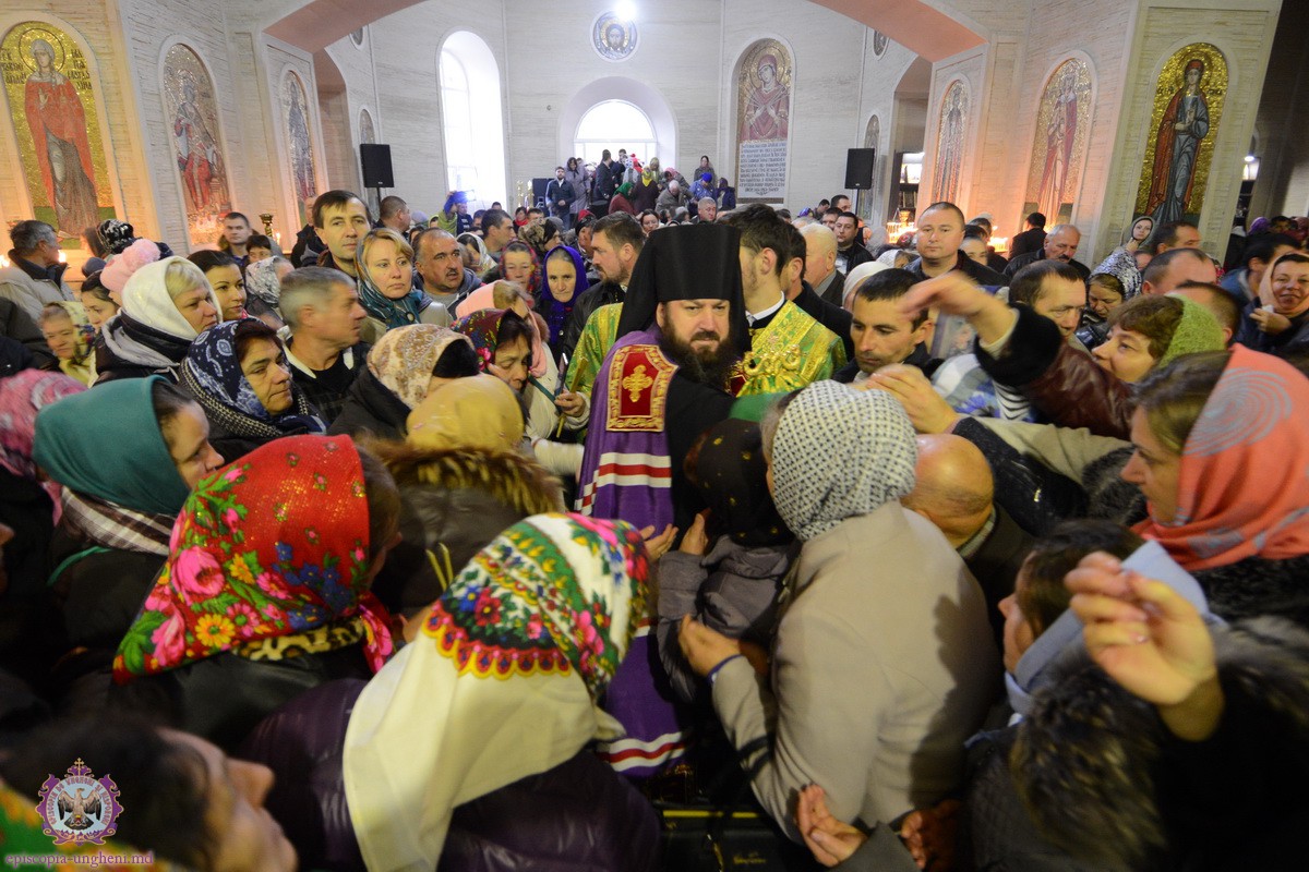 După citirea pericopei evanghelice, Preasfinţitul PETRU a ţinut un cuvînt de învăţătură din viaţa Cuvioasei Parascheva: ,,Mari sunt darurile împărtăşite nouă de Dumnezeu prin această aleasă de Dumnezeu fecioară. Ea a fost pentru ţăra noastră ca un scut de apărare în vremea celor 2 războaie mondiale, a fost cea care a sprijinit famiile cele dezinate întărindu-le casele lor, împăcându-i pe soţii cei certaţi care erau gata să divorţeze. Anume ea a fost cea care a vindecat pe mulţi dintre bolnavi de bolile şi neputinţele lor. Sf. Parascheva i-a iubit dintotdeauna pe cei necăjiţi şi împovăraţi fiind asemenea Domnului, milostivă şi iubitoare de oameni!